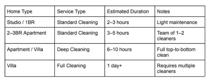 Most companies charge hourly for basic cleaning and fixed rates for deep-clean or villa-cleaning packages.